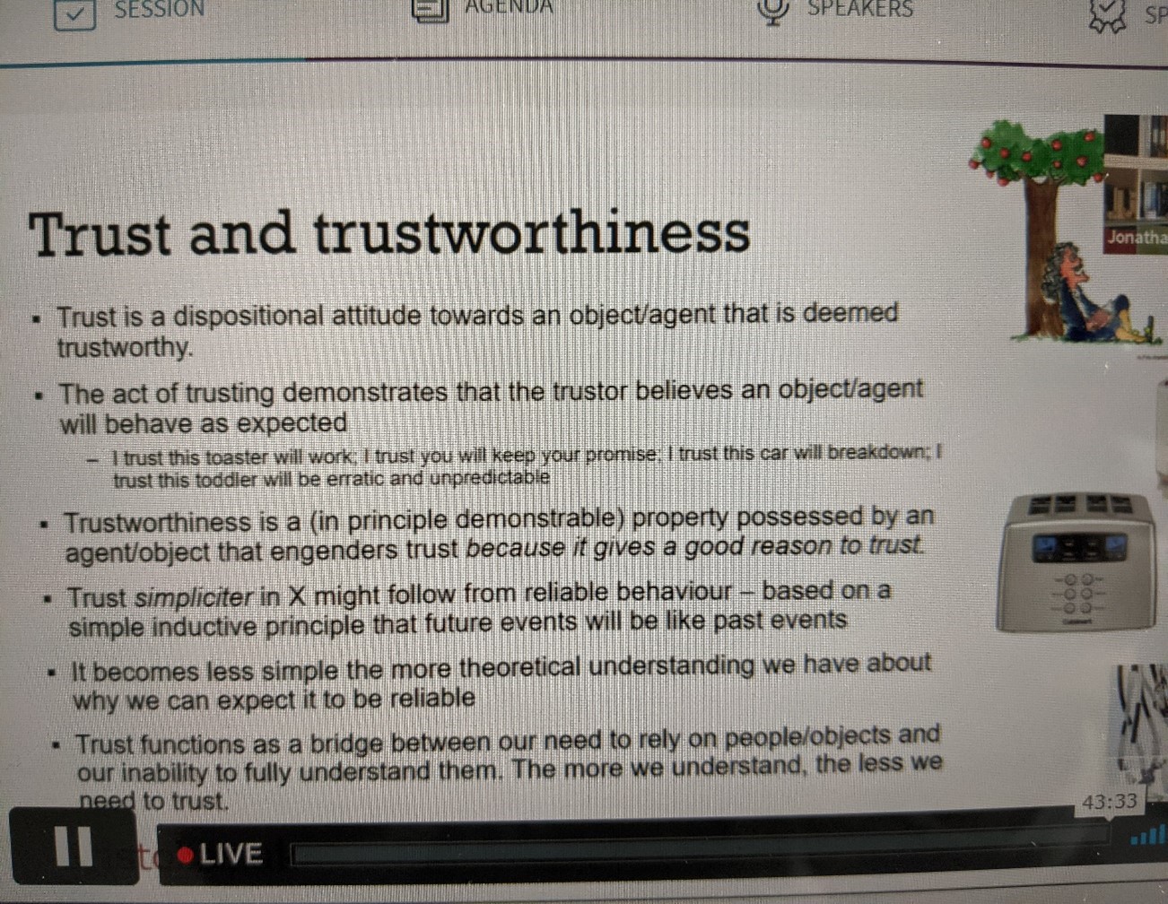 The discussion around trust being an emotion was fascinating because as a lawyer, it made me question how we could even begin to regulate this. I also wondered how this fit in with emotional AI and the current regulation we have. I believe that there may be a place for this in my research.